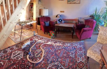 Pokoje jsou zajímavě řešeny jako mezonetové a ubytovací část je citlivě a vkusně vybavena starobylým nábytkem. Každý pokoj má vlastní moderní koupelnu se sprchovacím koutem a wc. Zapůjčit lze dětskou postýlku a je tu možnost i přistýlky.