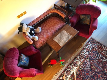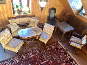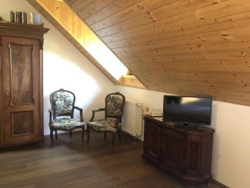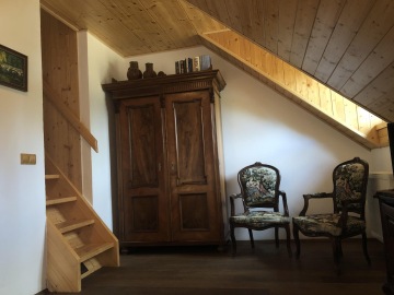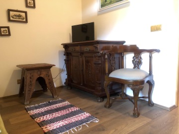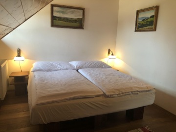 Jeden pokoj je větší s okny do zajrady, má manželskou postel v přízemí pokoje, dále také pohovku, skříň a dobové křeslo. Taktéž je tu koupelna, ručníky, mýdla.