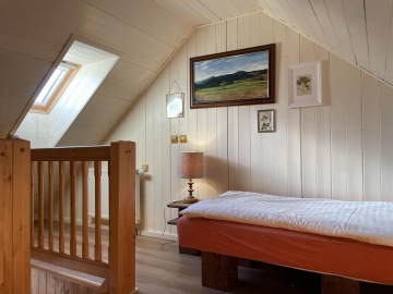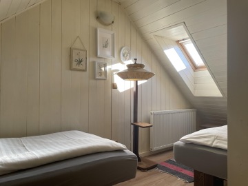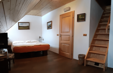 2 pokoje jsou vybaveny dvoulůžkem v patře, dole potom skříňí a rozkládací pohovkou. Součástí pokojů jsou koupelny a WC. V ceně pobytu je pro hosty vždy ručník s mýdlem.